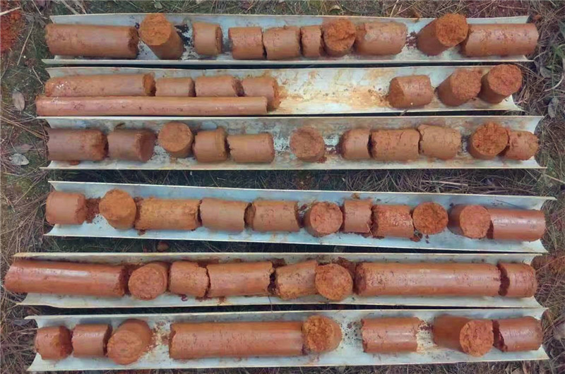 鉆進過程中提升和給進是依靠手搖卷揚裝置配套提引器或加壓手輪通過鏈輪鏈條來完成,大大提高了鉆機提升和加壓力。鉆進過程中,利用泥漿泵冷卻回轉器和鉆頭,并攜帶土巖屑返回地表。隨著鉆具向地下延伸,所需要的土巖樣不斷進入到巖心管內,當土巖樣達到預定深度后,便可以將鉆桿取出,實現了單回次取樣作業。重復以上步驟,直至全孔取樣完成。
